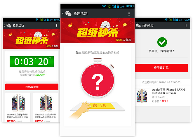 微信竞拍新方式,商家发布特价商品,粉丝选中商品之后通过邀请好友助力获得秒杀时间的增减,从而可以第一时间抢够商品。